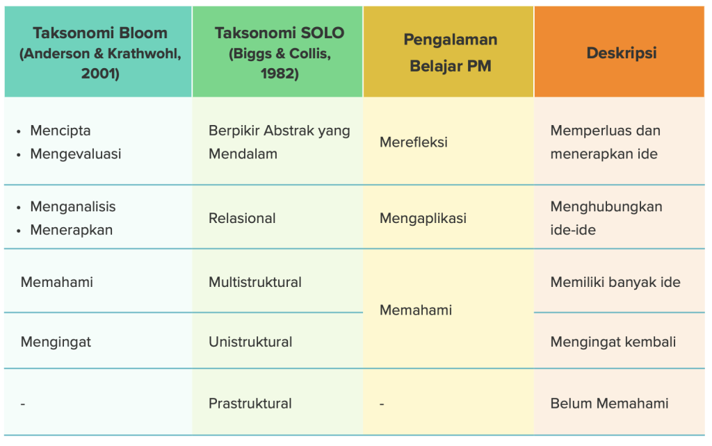 Pembelajaran Mendalam memberikan pengalaman belajar kepada peserta didik dengan memahami, mengaplikasi, dan merefleksi. Pengalaman belajar yang diciptakan proses yang dialami individu dalam memperoleh pengetahuan, keterampilan, sikap, atau nilai. Pengalaman ini terjadi di berbagai lingkungan, seperti di sekolah, tempat kerja, rumah, atau dalam kehidupan sehari-hari, dan melibatkan interaksi dengan materi pelajaran, guru, teman sejawat, atau lingkungan. Pengalaman belajar merupakan aktivitas yang diberikan guru dalam PM yang berkaitan dengan taksonomi SOLO (Structure of Observed Learning Outcomes) (Biggs & Collis, 1982) dan taksonomi Bloom (Anderson & Krathwohl, 2001). Taksonomi SOLO menggunakan kerangka berpikir yang dirancang untuk mengevaluasi dan memahami tingkat kompleksitas dalam pembelajaran siswa. Dikembangkan oleh John Biggs dan Kevin Collis pada tahun 1982, taksonomi ini membantu guru untuk menilai kualitas hasil belajar siswa berdasarkan tingkat pemahaman mereka terhadap suatu topik. Taksonomi SOLO mengklasifikasikan hasil belajar ke dalam lima tingkat hierarki, mulai dari pemahaman yang dangkal hingga yang lebih mendalam yaitu; (1). Prastruktural: Tidak memahami materi; (2). Unistruktural: Memahami satu aspek; (3). Multistruktural: Memahami beberapa aspek, tanpa menghubungkan; (4). Relasional: Menghubungkan berbagai aspek secara kohesif; (5). Berpikir abstrak yang mendalam: Menerapkan pemahaman dalam konteks baru. Taksonomi SOLO dan taksonomi Bloom (2001) dalam PM dapat dilihat pada tabel di bawah ini: